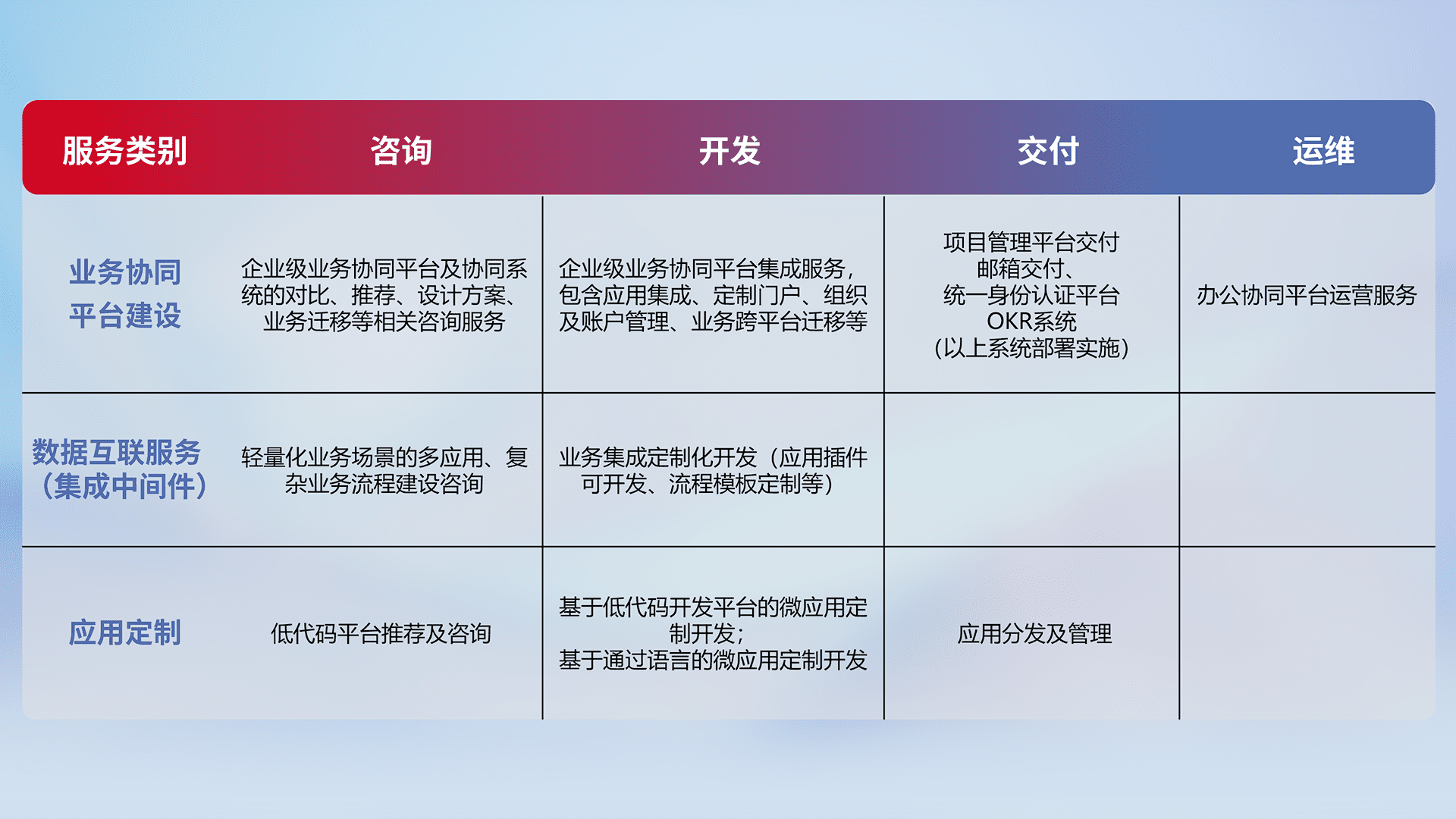 针对钉钉、、企微、、IDaas等平台级产品提供产品的规划、、、方案、、交付、、定制化开发等服务,,,,实现如统一协同办公、、智能客户服务、、混合会议管理、、智能数据查询、、、等业务场景,,实现数字化转型。。。